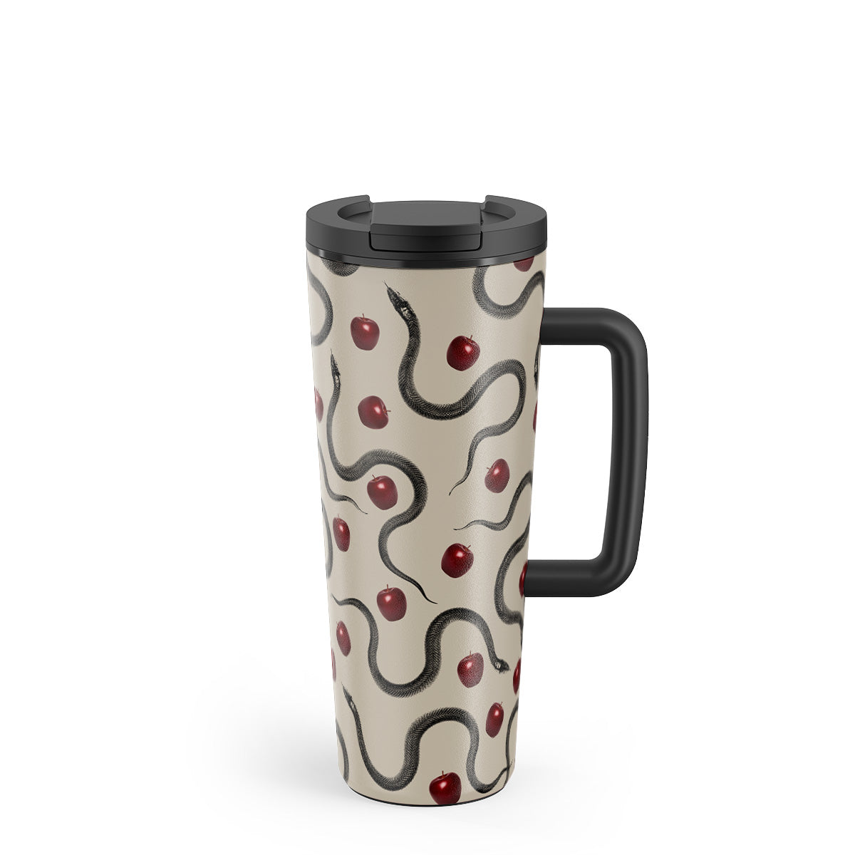 En este diseño: manzanas rojas brillantes, serpientes enroscadas y tonos beis.