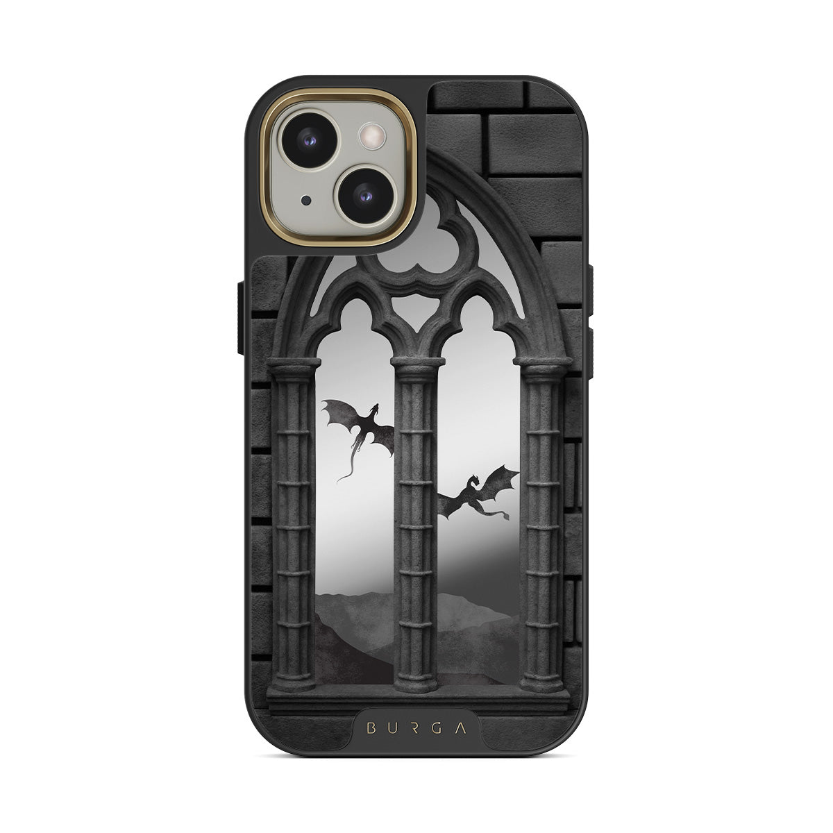 En este diseño: arcos góticos, dragones voladores, criaturas místicas, inserción de espejo
