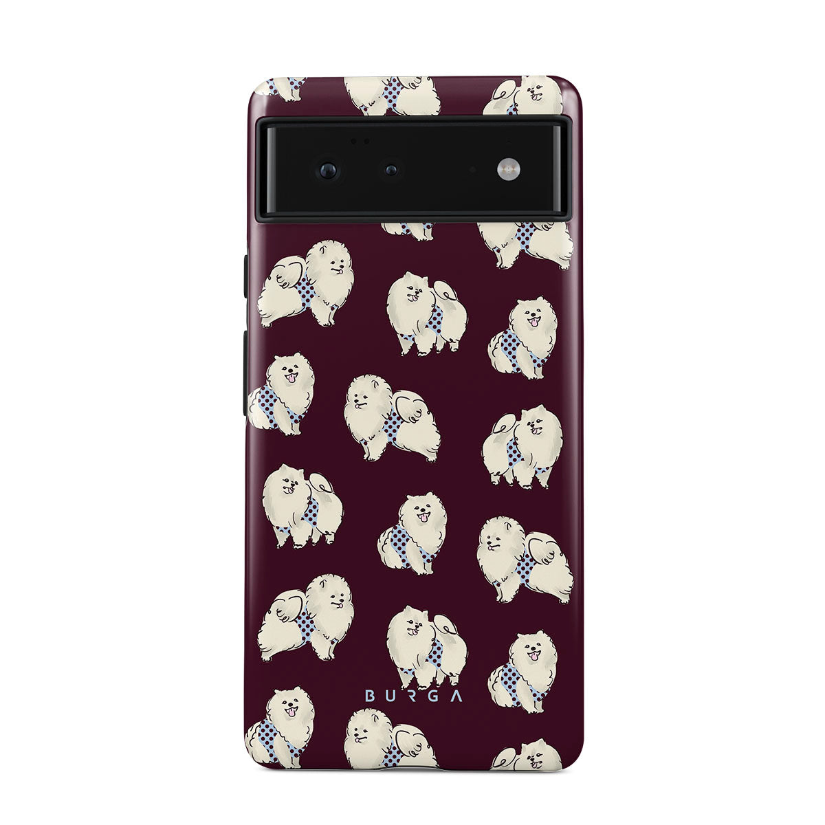 En este diseño: perros blancos y esponjosos sobre un fondo burdeos oscuro, caniches y mascotas.