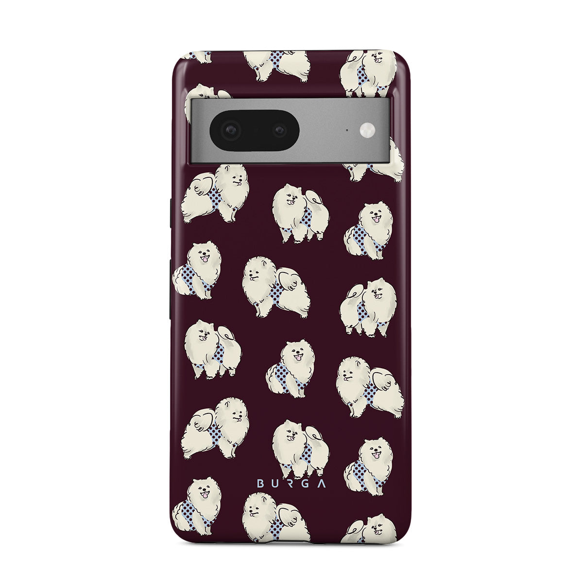 En este diseño: perros blancos y esponjosos sobre un fondo burdeos oscuro, caniches y mascotas.