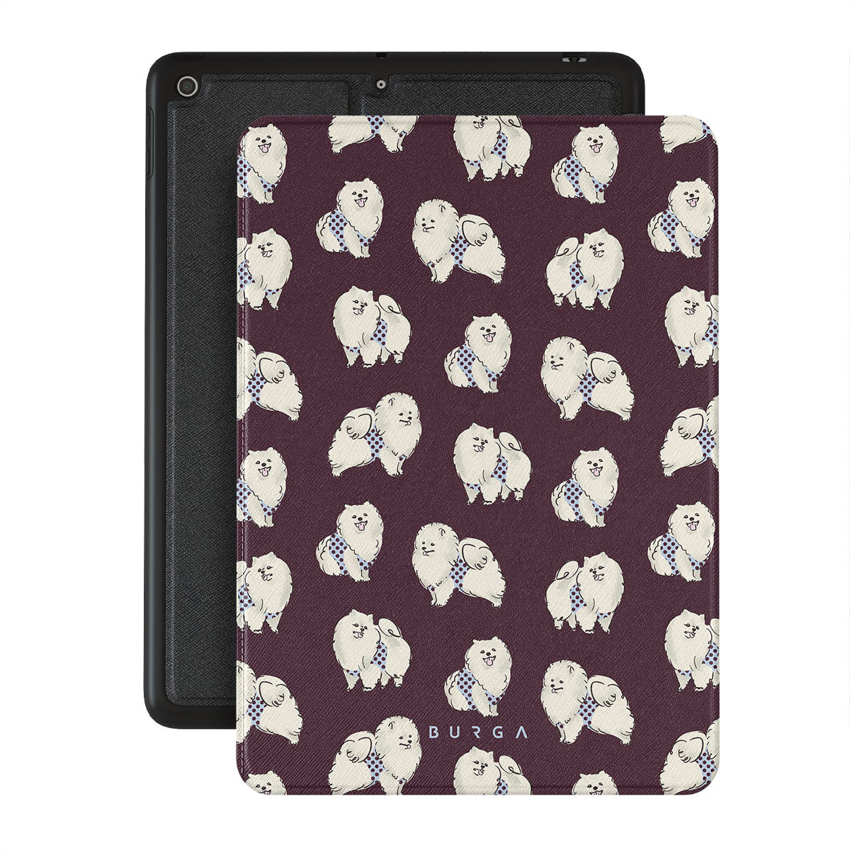 En este diseño: perros blancos y esponjosos sobre un fondo burdeos oscuro, caniches y mascotas.