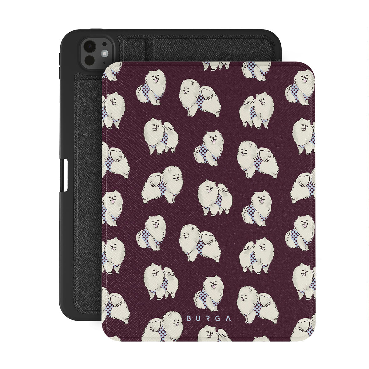 En este diseño: perros blancos y esponjosos sobre un fondo burdeos oscuro, caniches y mascotas.