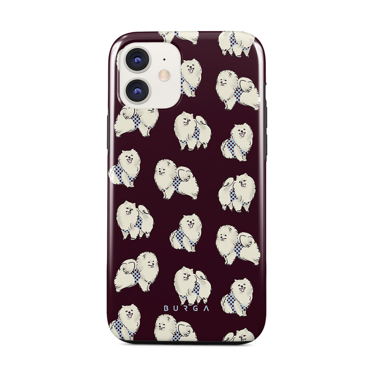 En este diseño: perros blancos y esponjosos sobre un fondo burdeos oscuro, caniches y mascotas.