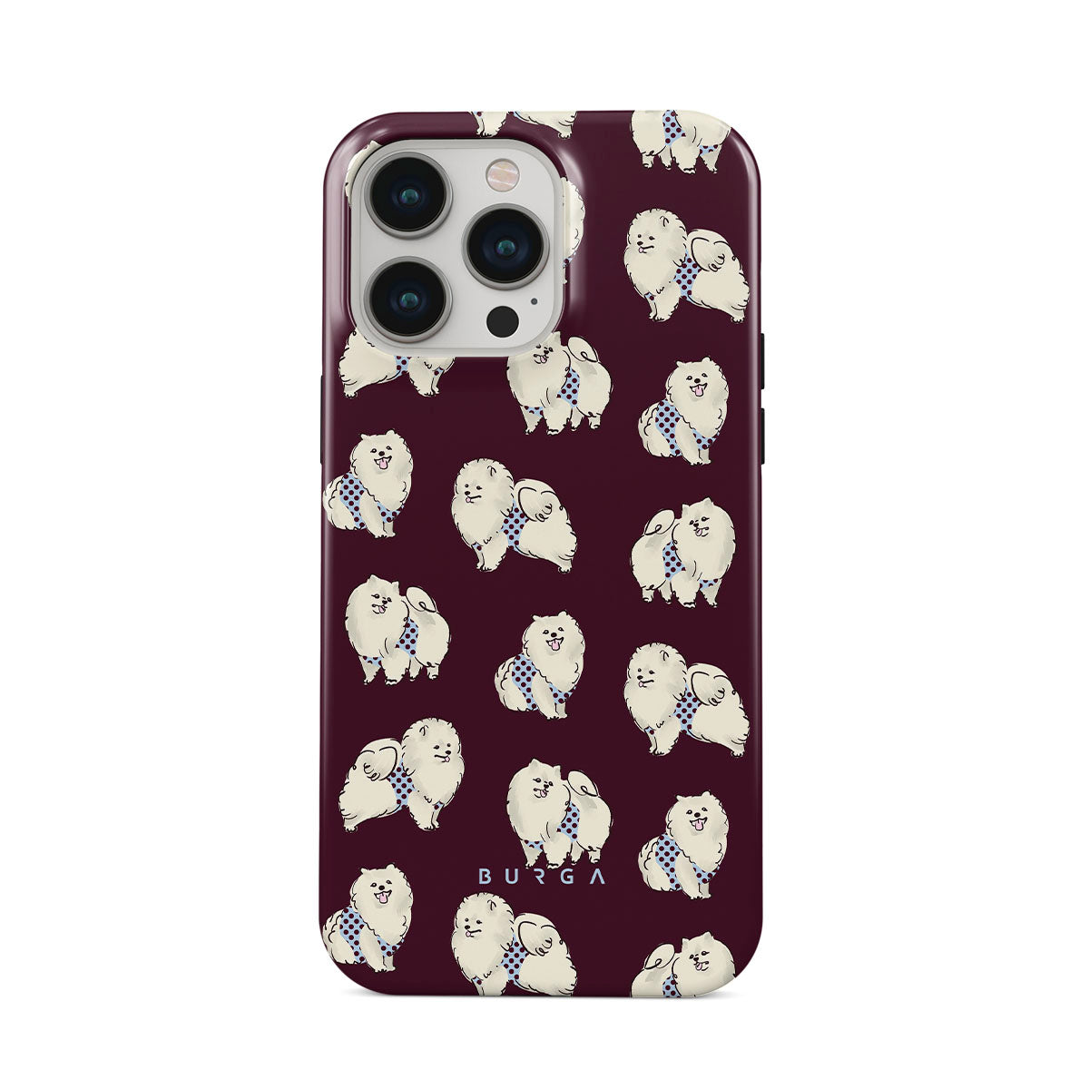 En este diseño: perros blancos y esponjosos sobre un fondo burdeos oscuro, caniches y mascotas.