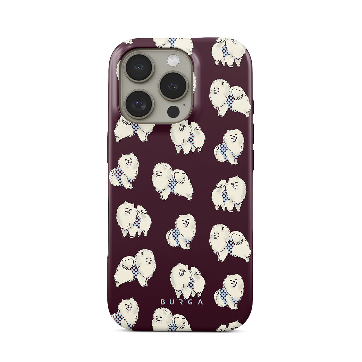 En este diseño: perros blancos y esponjosos sobre un fondo burdeos oscuro, caniches y mascotas.