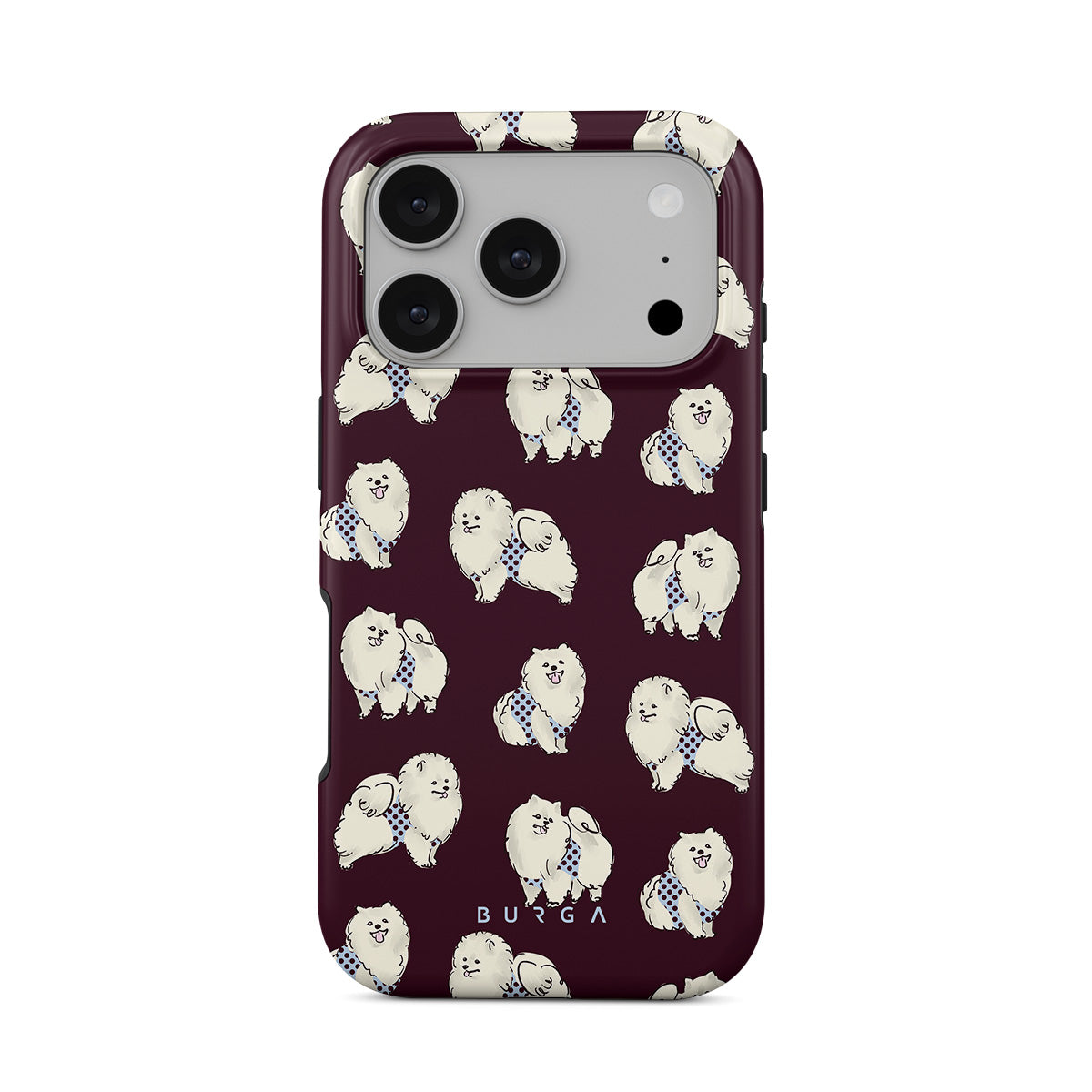 En este diseño: perros blancos y esponjosos sobre un fondo burdeos oscuro, caniches y mascotas.