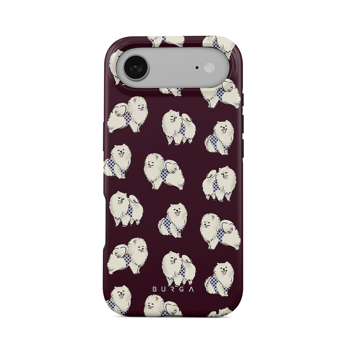En este diseño: perros blancos y esponjosos sobre un fondo burdeos oscuro, caniches y mascotas.