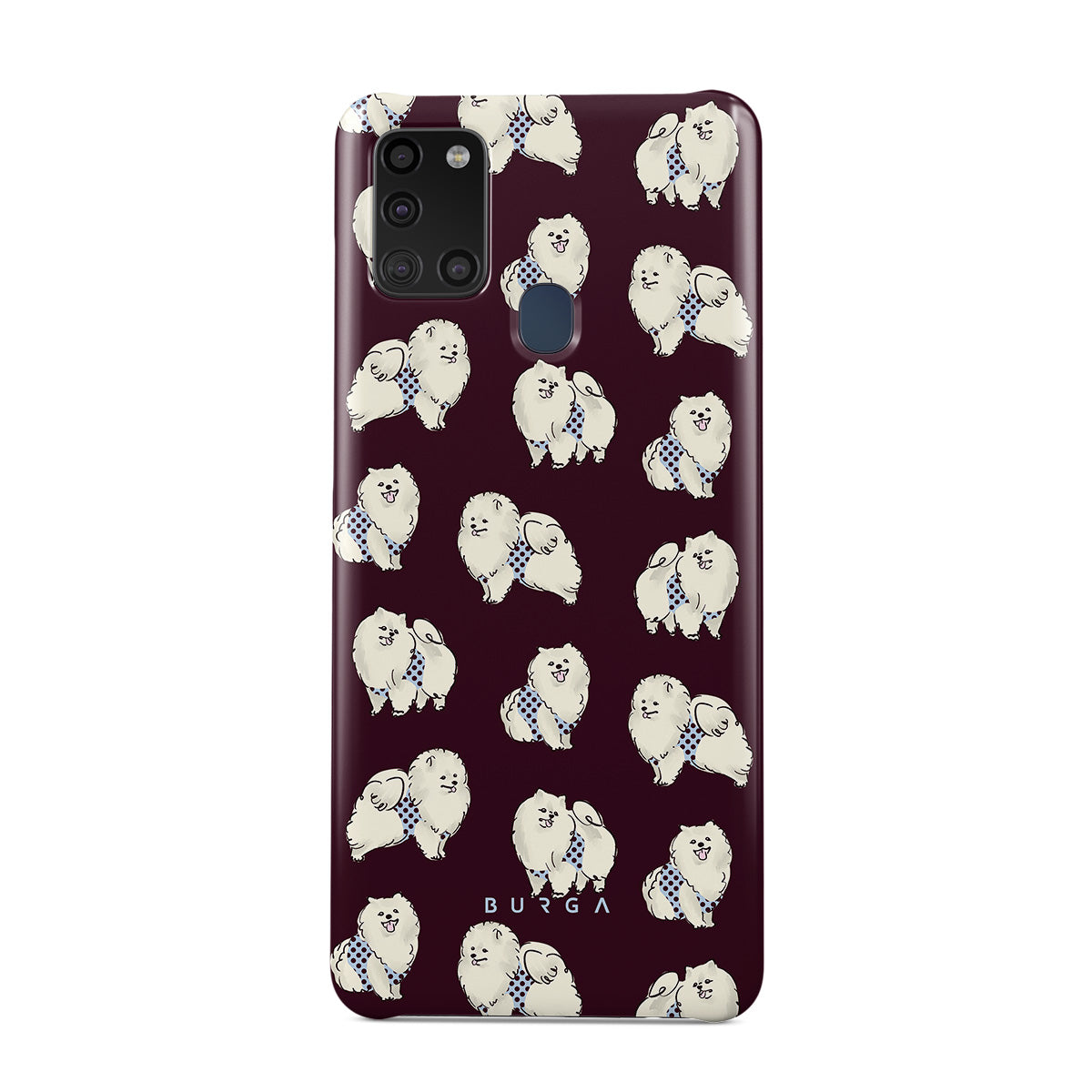 En este diseño: perros blancos y esponjosos sobre un fondo burdeos oscuro, caniches y mascotas.