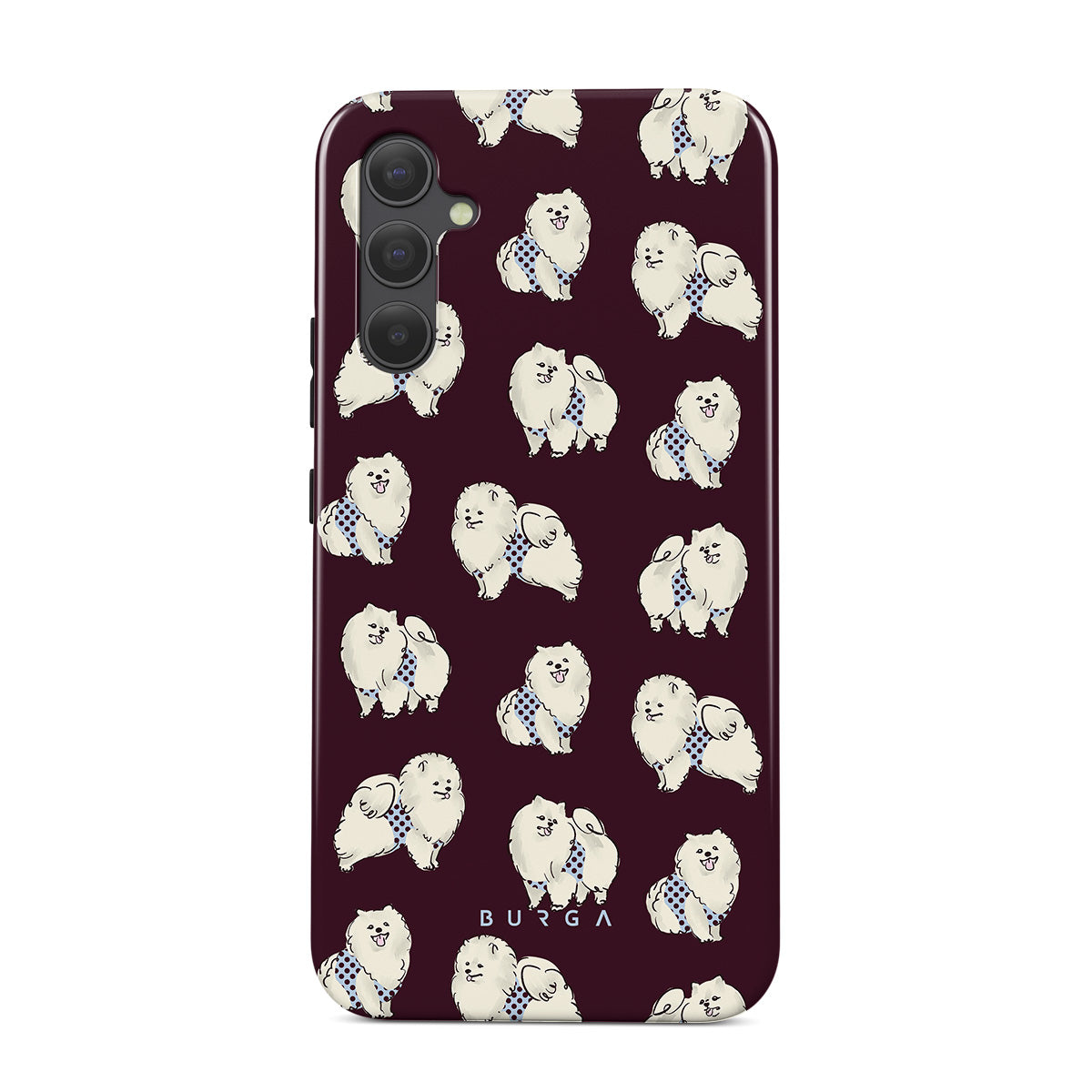 En este diseño: perros blancos y esponjosos sobre un fondo burdeos oscuro, caniches y mascotas.