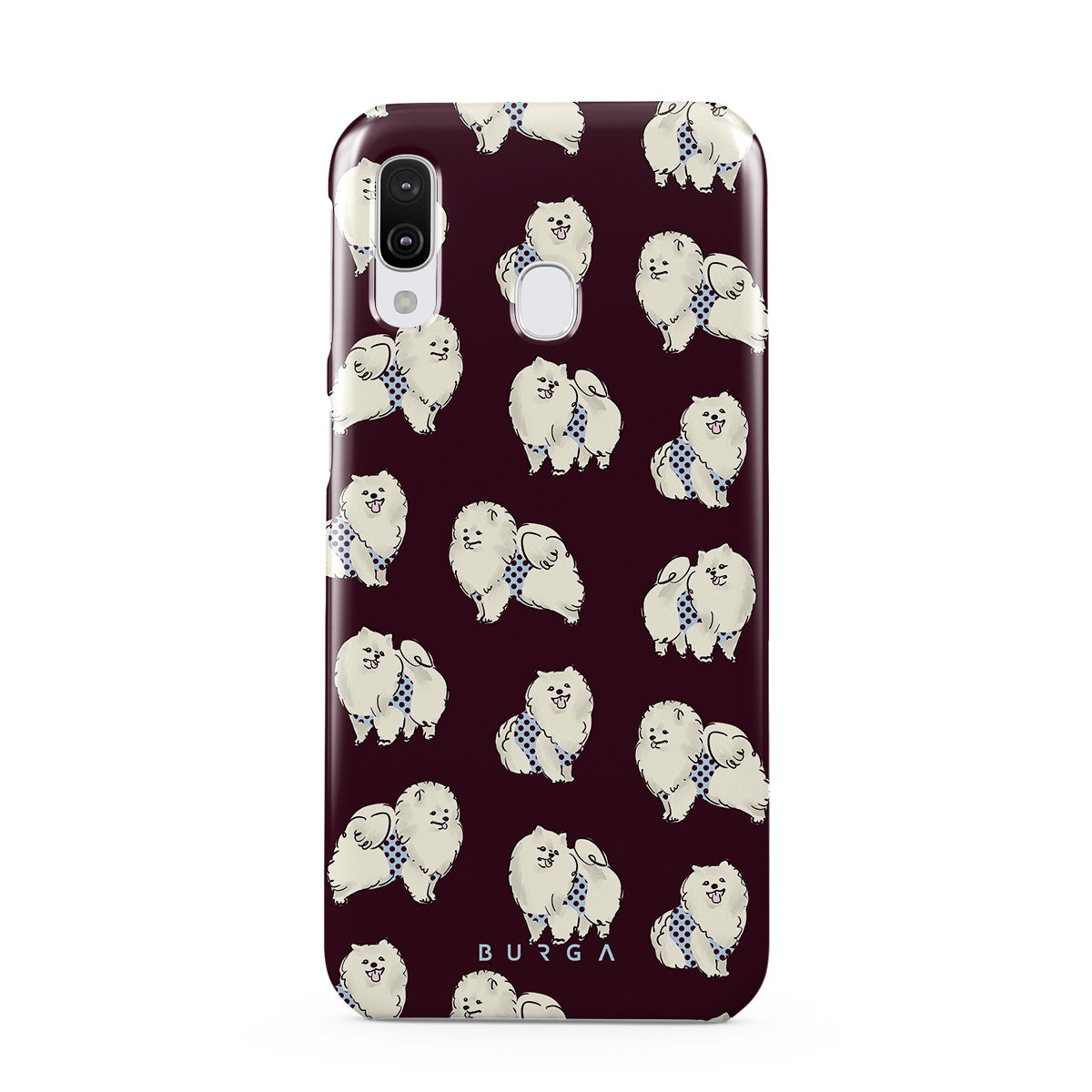 En este diseño: perros blancos y esponjosos sobre un fondo burdeos oscuro, caniches y mascotas.
