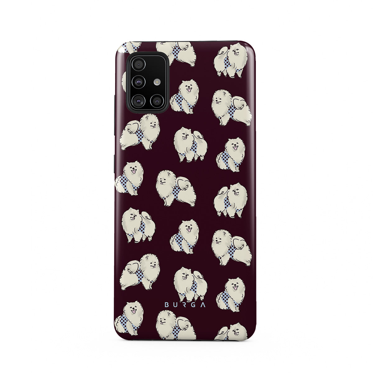 En este diseño: perros blancos y esponjosos sobre un fondo burdeos oscuro, caniches y mascotas.