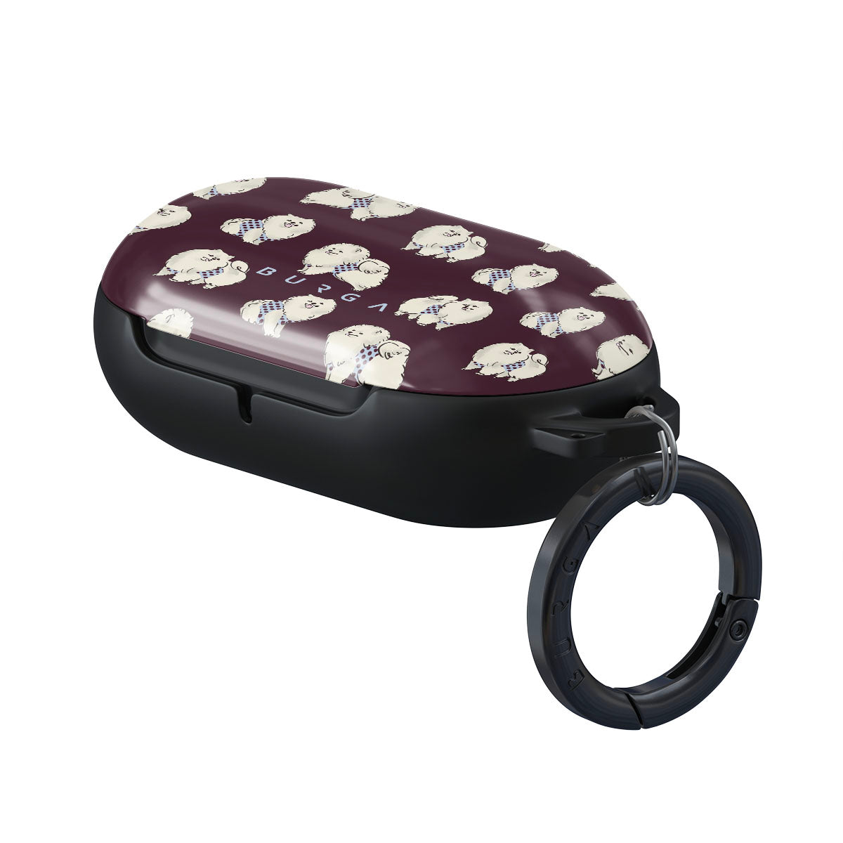 En este diseño: perros blancos y esponjosos sobre un fondo burdeos oscuro, caniches y mascotas.