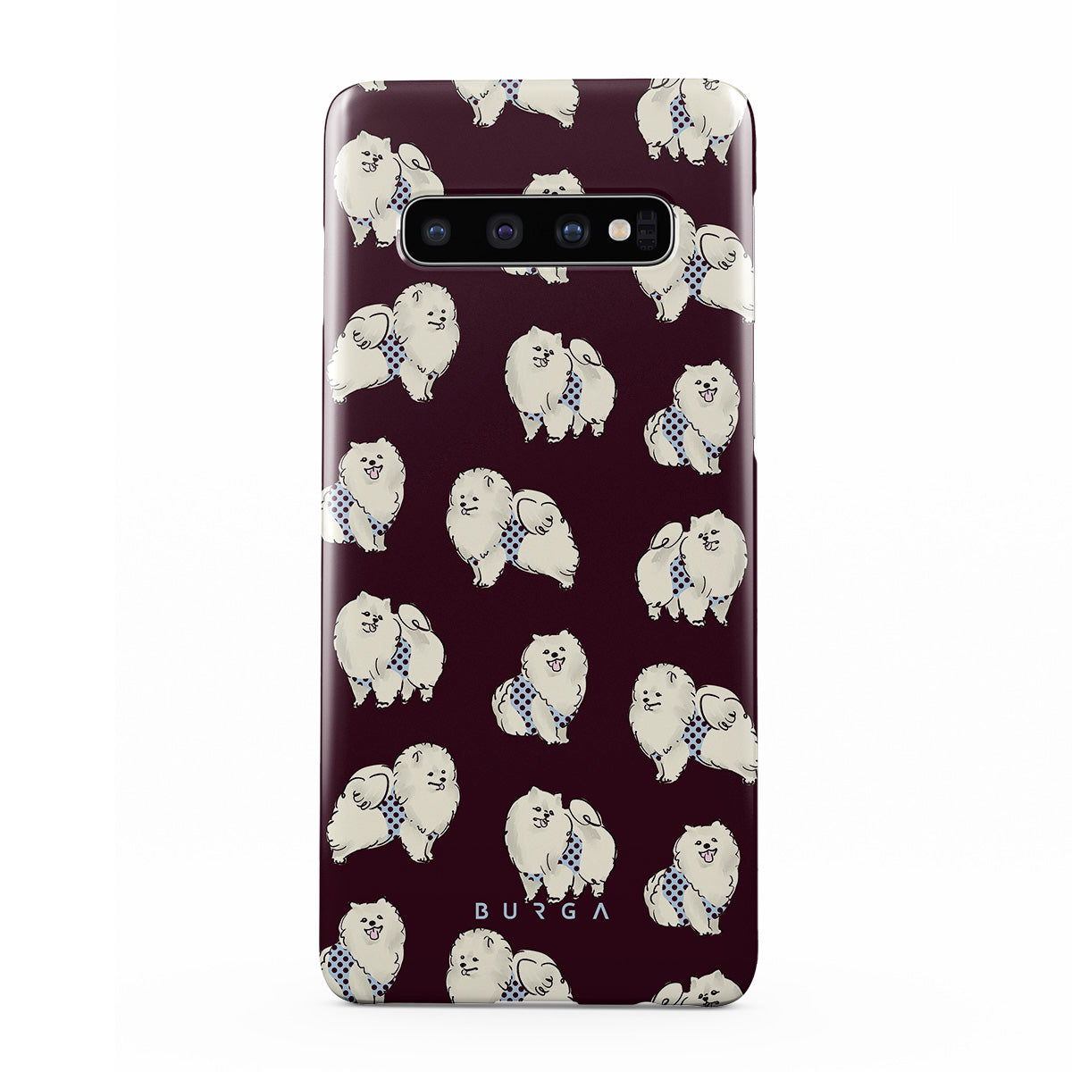 En este diseño: perros blancos y esponjosos sobre un fondo burdeos oscuro, caniches y mascotas.