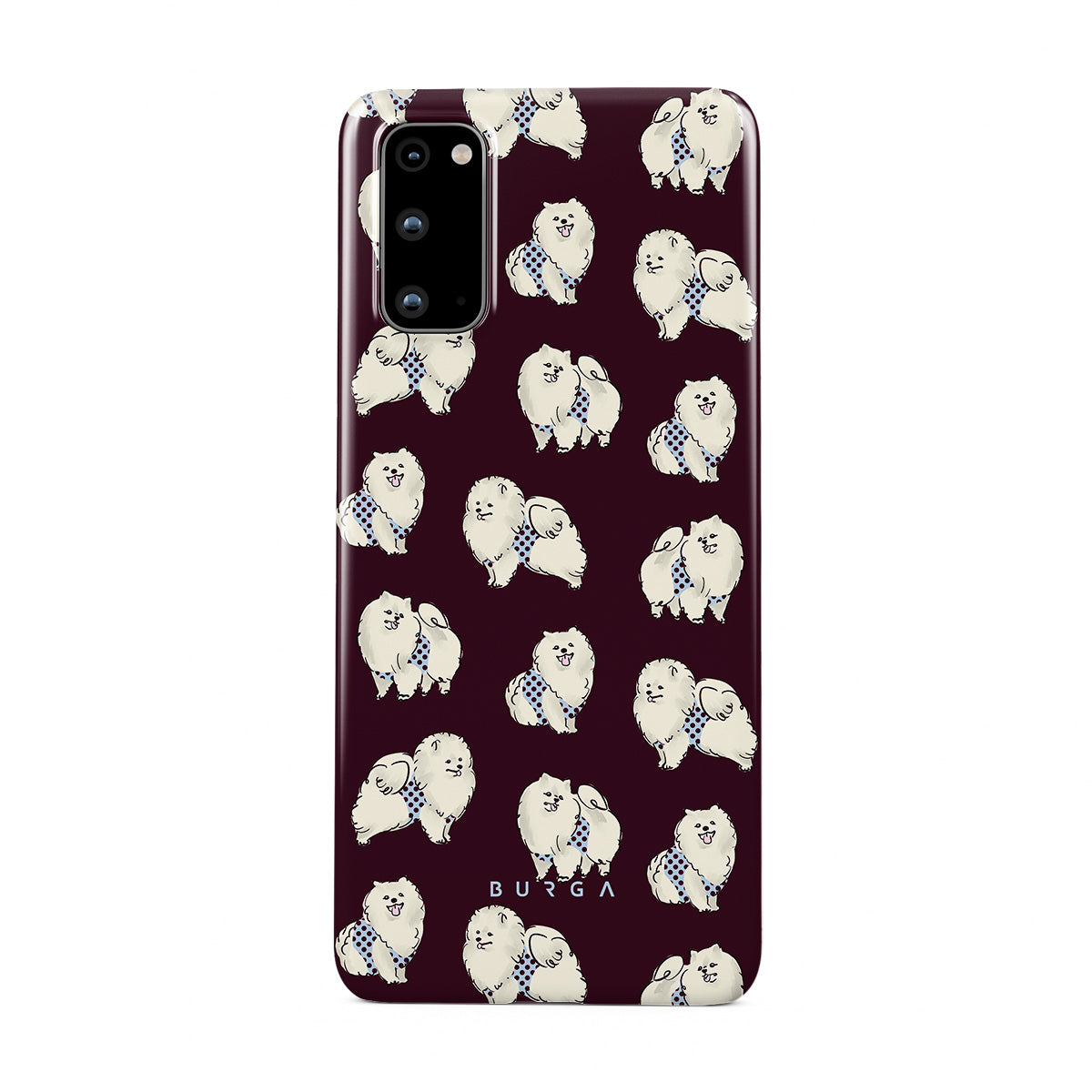 En este diseño: perros blancos y esponjosos sobre un fondo burdeos oscuro, caniches y mascotas.