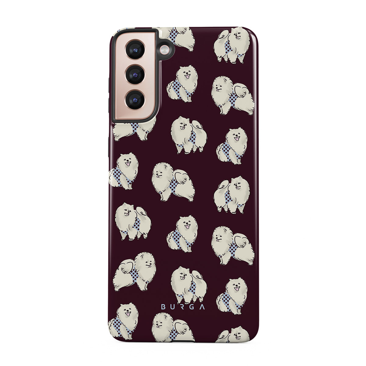 En este diseño: perros blancos y esponjosos sobre un fondo burdeos oscuro, caniches y mascotas.
