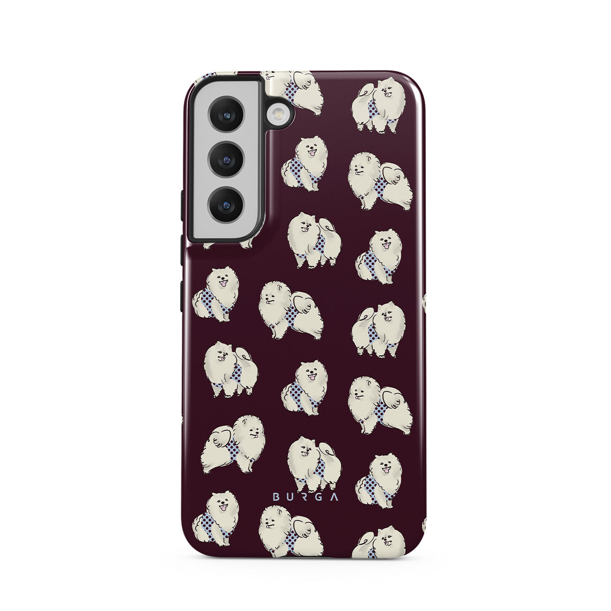 En este diseño: perros blancos y esponjosos sobre un fondo burdeos oscuro, caniches y mascotas.