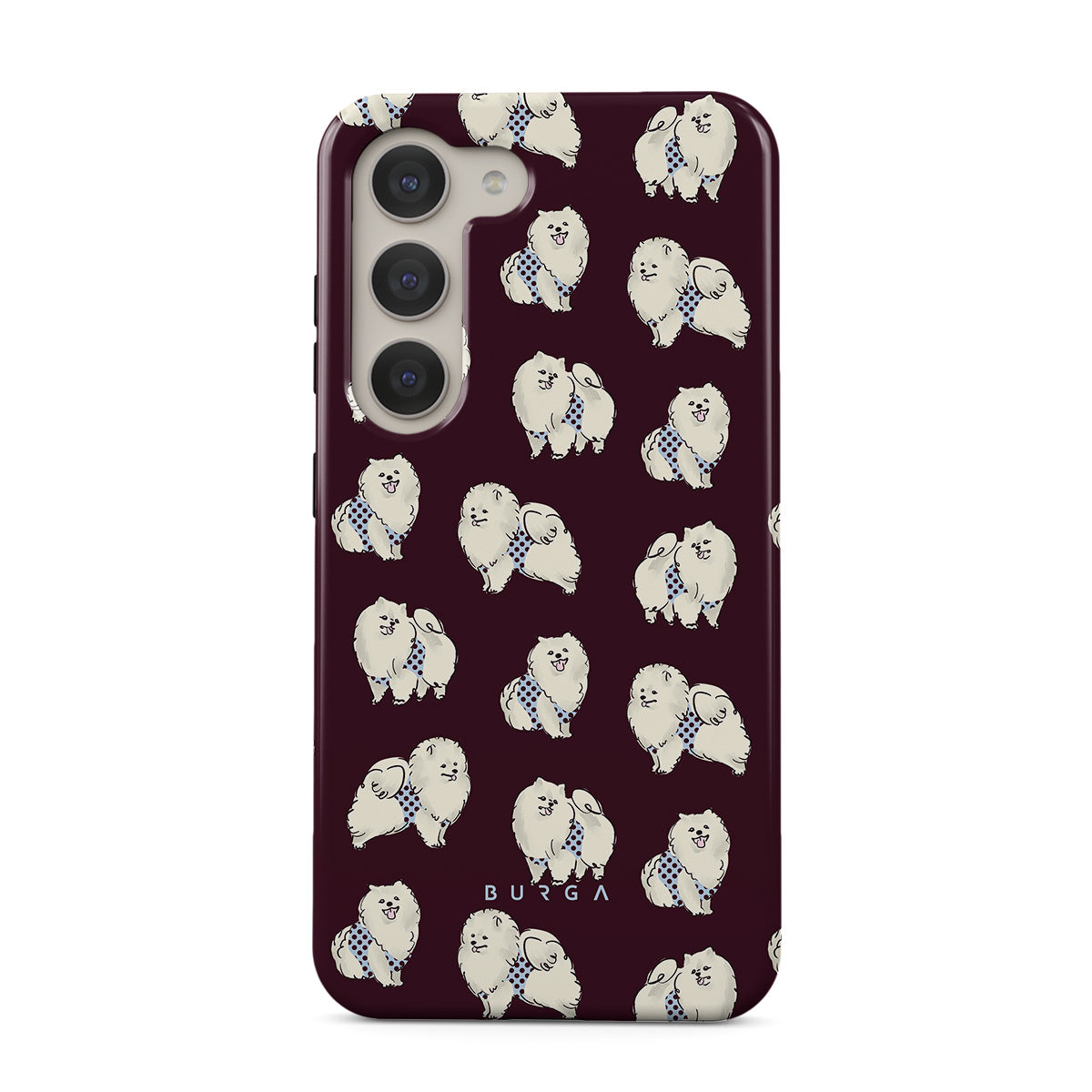 En este diseño: perros blancos y esponjosos sobre un fondo burdeos oscuro, caniches y mascotas.