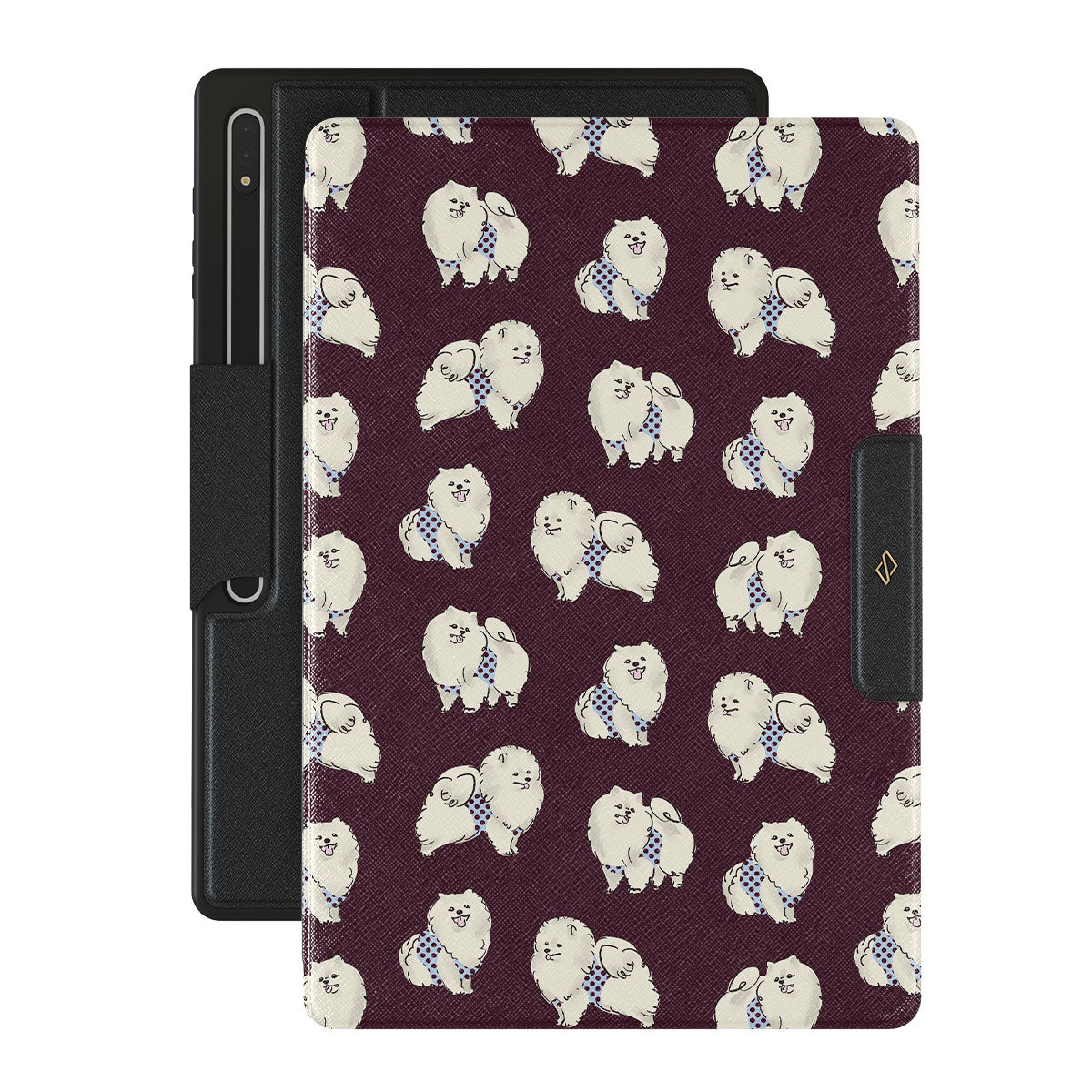 En este diseño: perros blancos y esponjosos sobre un fondo burdeos oscuro, caniches y mascotas.