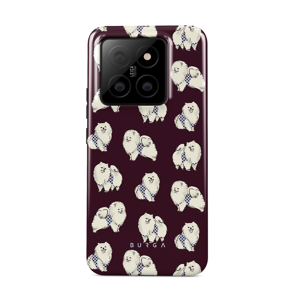 En este diseño: perros blancos y esponjosos sobre un fondo burdeos oscuro, caniches y mascotas.
