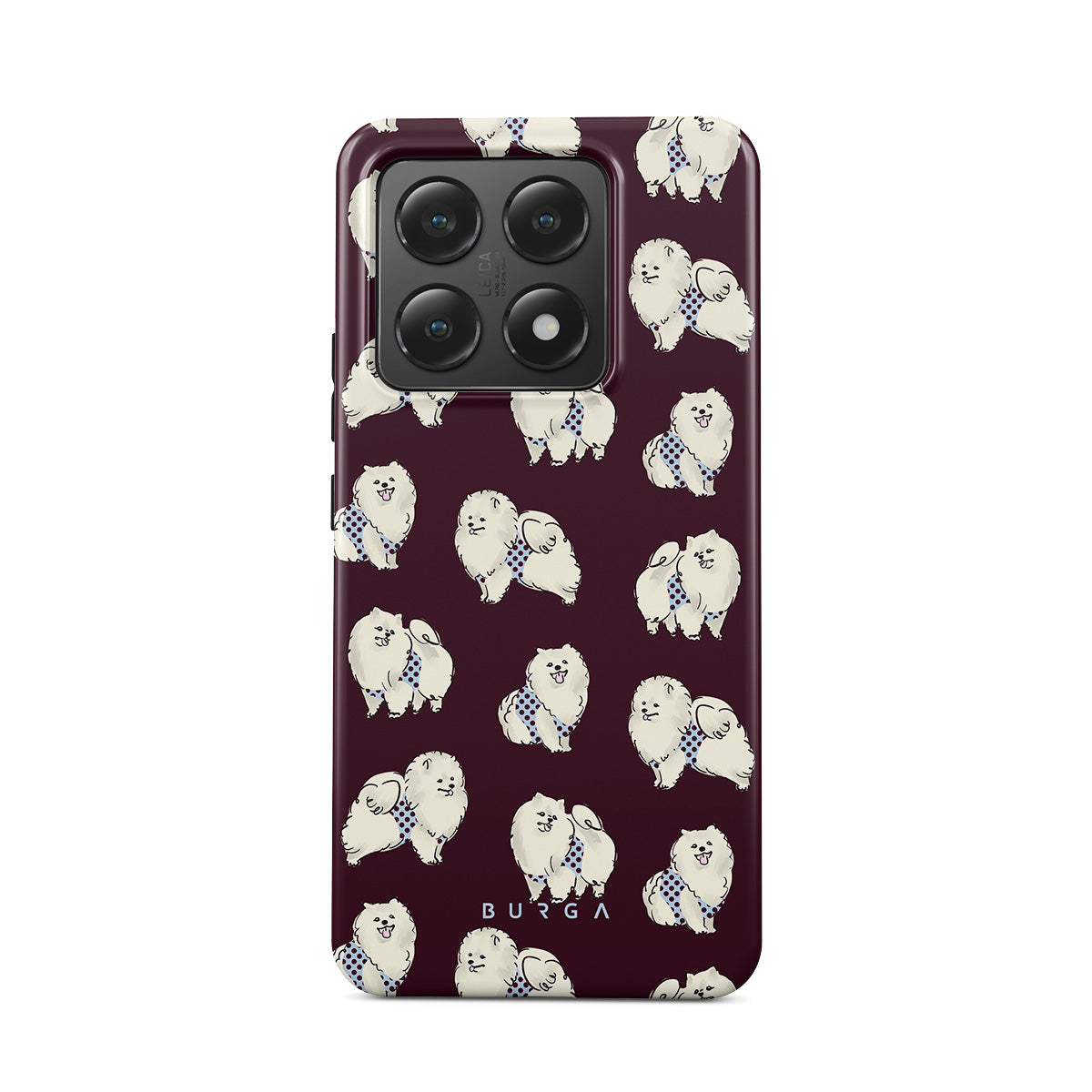 En este diseño: perros blancos y esponjosos sobre un fondo burdeos oscuro, caniches y mascotas.