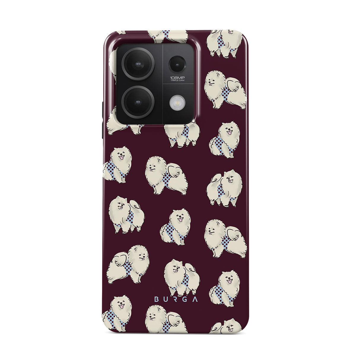 En este diseño: perros blancos y esponjosos sobre un fondo burdeos oscuro, caniches y mascotas.