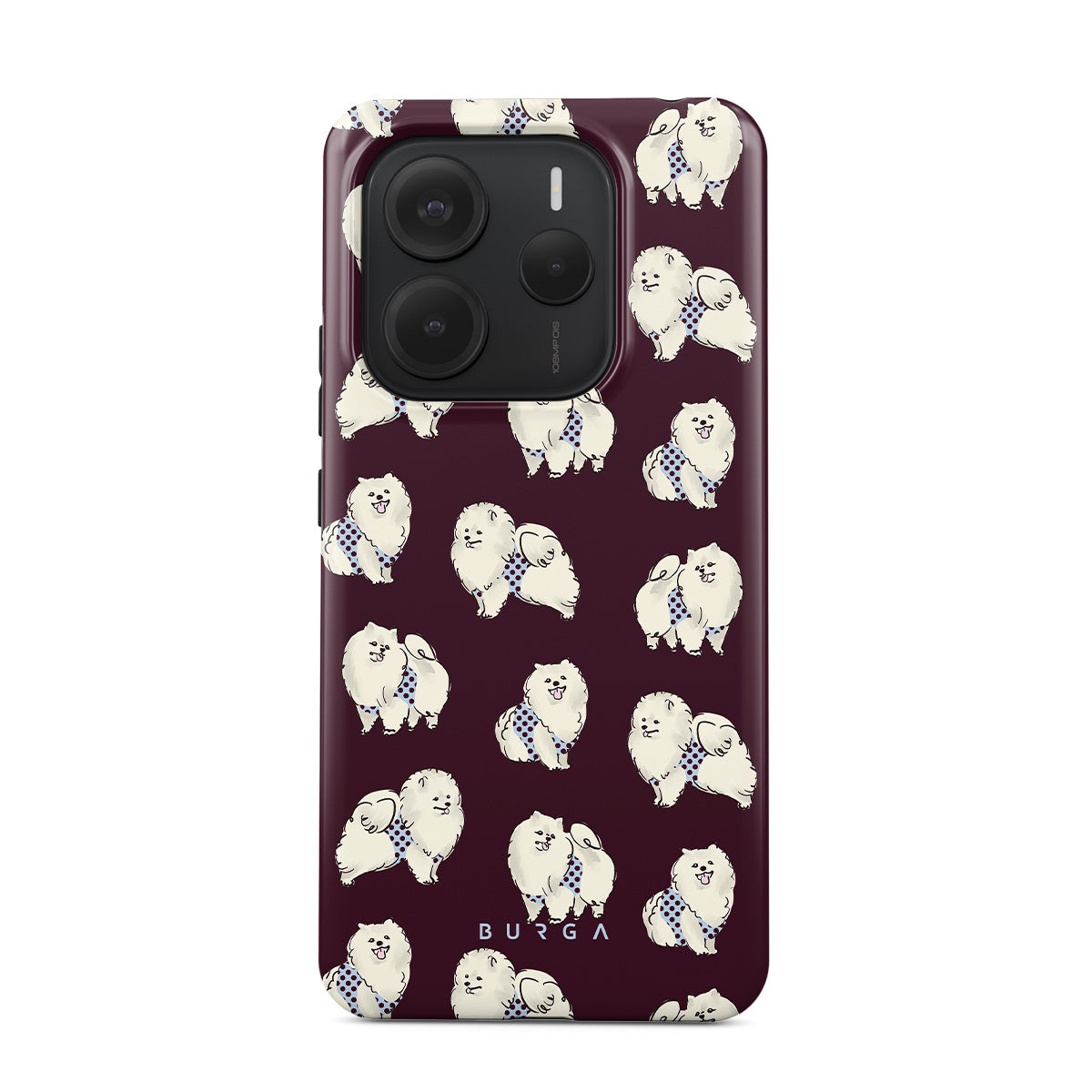 En este diseño: perros blancos y esponjosos sobre un fondo burdeos oscuro, caniches y mascotas.