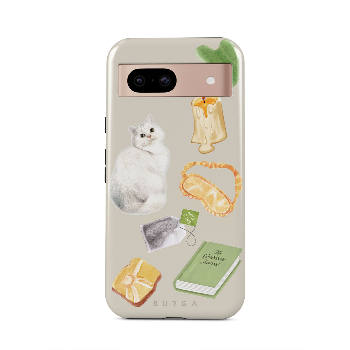 En este diseño: gato blanco, libro verde, vela, barra de Gua Sha, antifaz para dormir, bolsa de té, cristal amarillo.