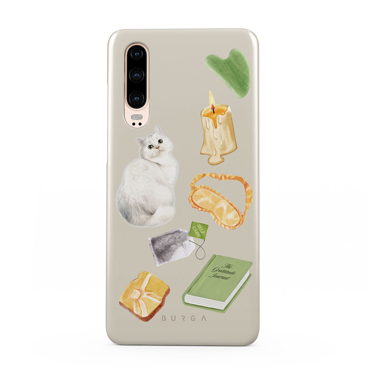 En este diseño: gato blanco, libro verde, vela, barra de Gua Sha, antifaz para dormir, bolsa de té, cristal amarillo.