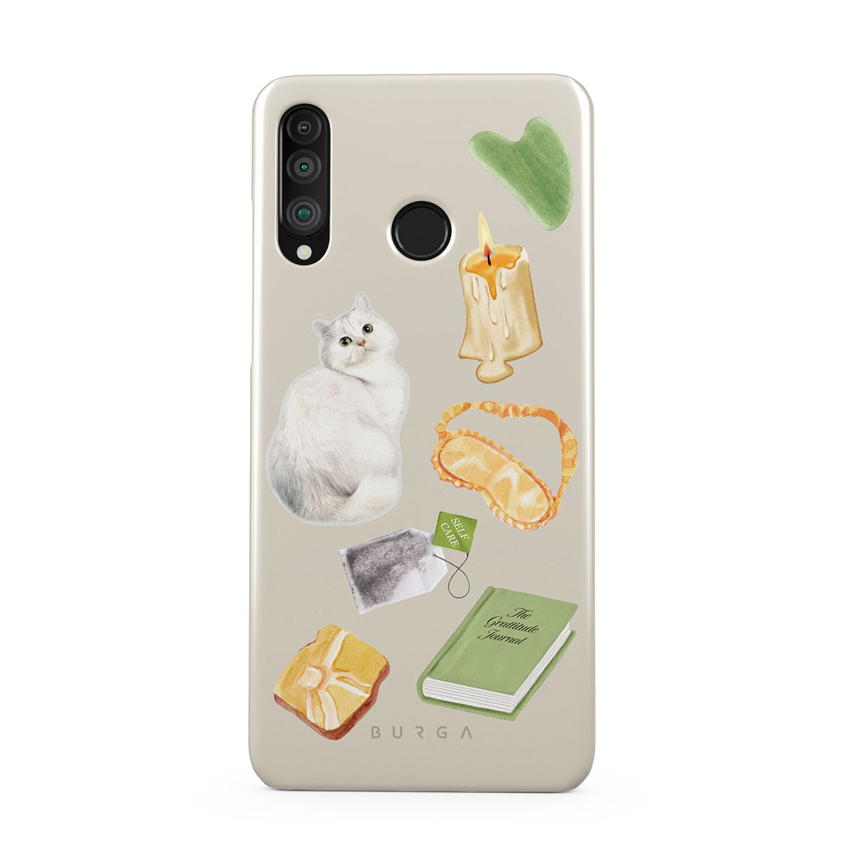 En este diseño: gato blanco, libro verde, vela, barra de Gua Sha, antifaz para dormir, bolsa de té, cristal amarillo.