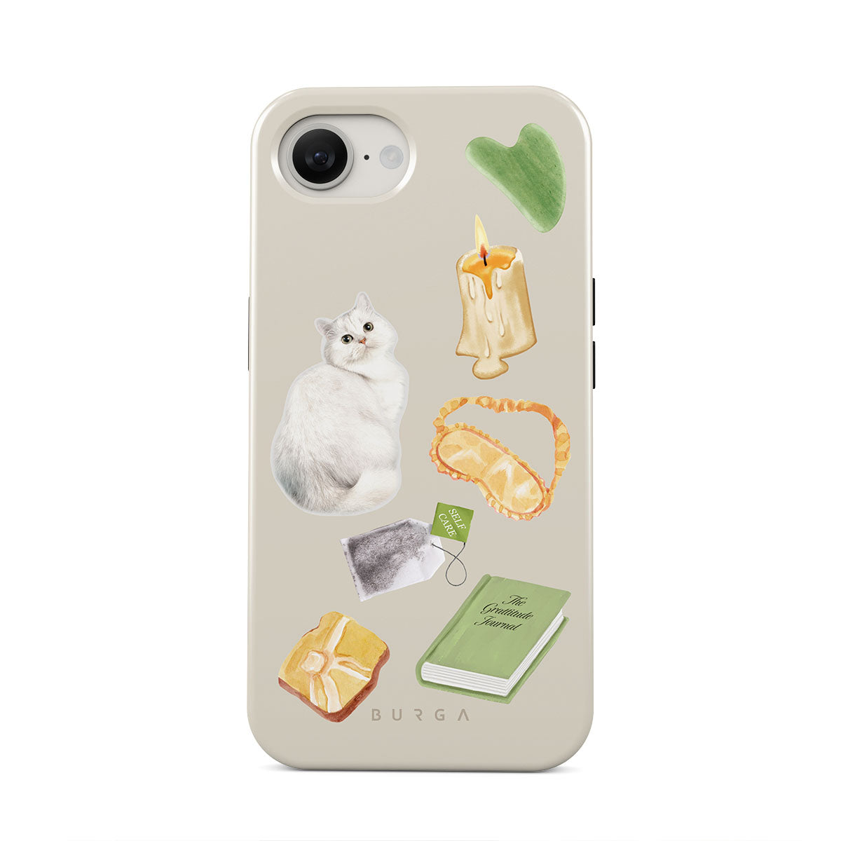 En este diseño: gato blanco, libro verde, vela, barra de Gua Sha, antifaz para dormir, bolsa de té, cristal amarillo.