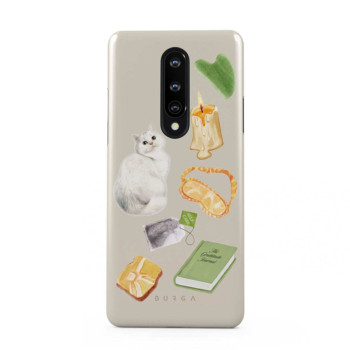 En este diseño: gato blanco, libro verde, vela, barra de Gua Sha, antifaz para dormir, bolsa de té, cristal amarillo.