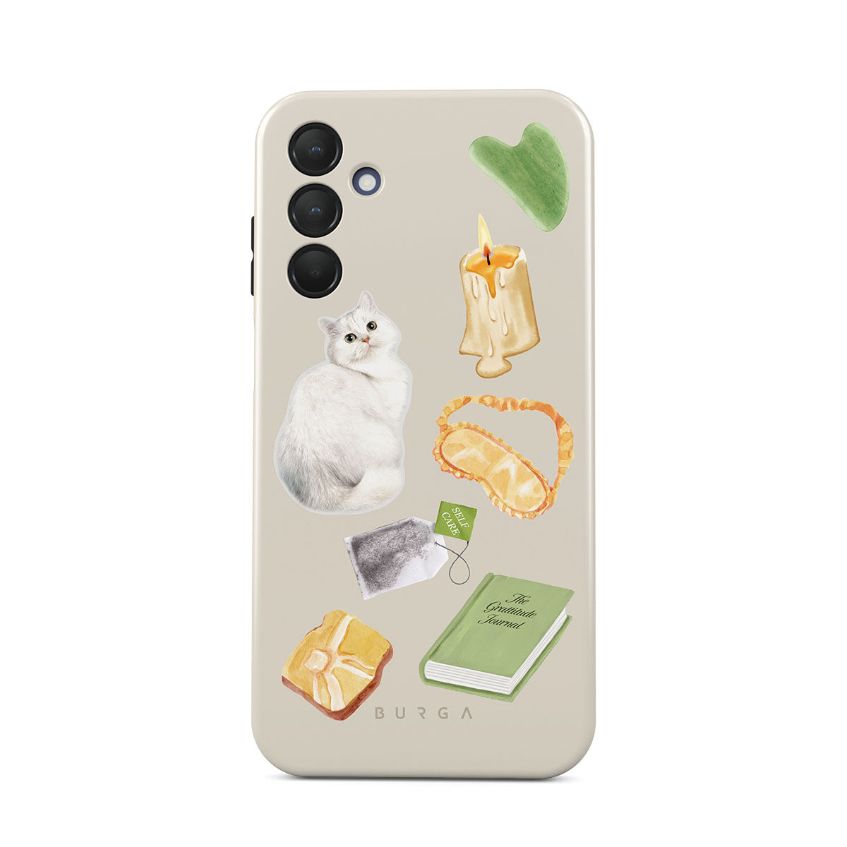 En este diseño: gato blanco, libro verde, vela, barra de Gua Sha, antifaz para dormir, bolsa de té, cristal amarillo.