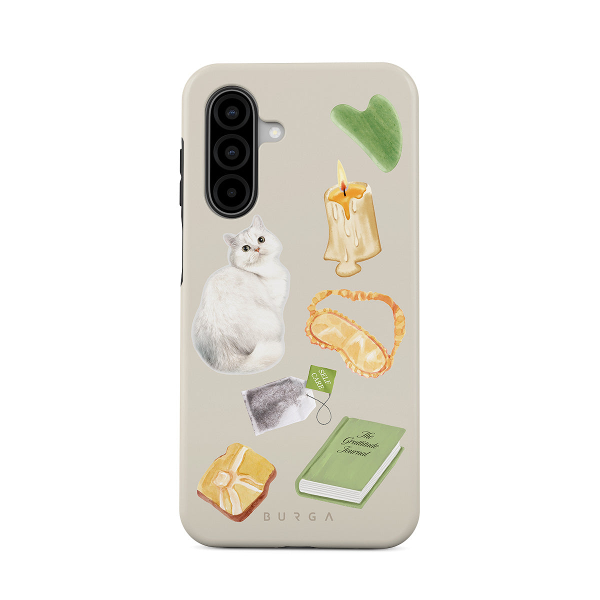 En este diseño: gato blanco, libro verde, vela, barra de Gua Sha, antifaz para dormir, bolsa de té, cristal amarillo.