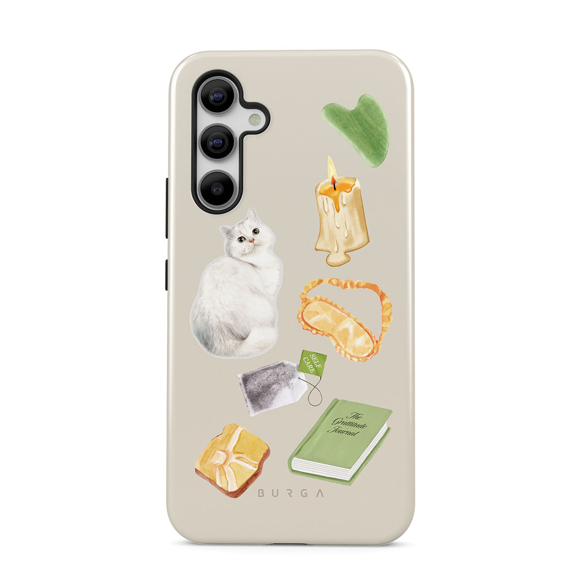 En este diseño: gato blanco, libro verde, vela, barra de Gua Sha, antifaz para dormir, bolsa de té, cristal amarillo.