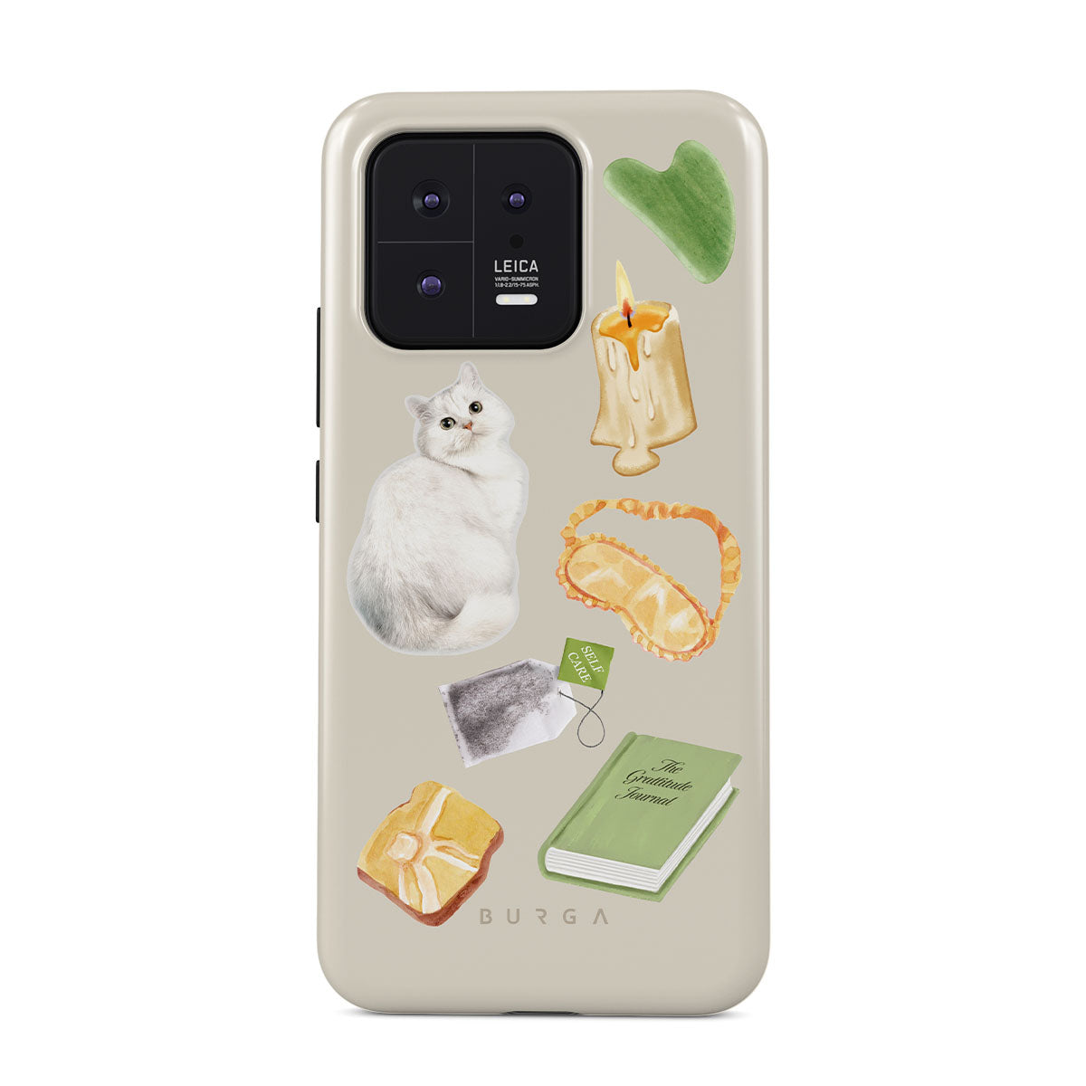 En este diseño: gato blanco, libro verde, vela, barra de Gua Sha, antifaz para dormir, bolsa de té, cristal amarillo.