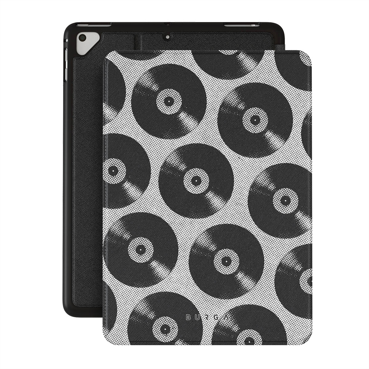Características de este diseño: discos de vinilo, blanco y negro, música