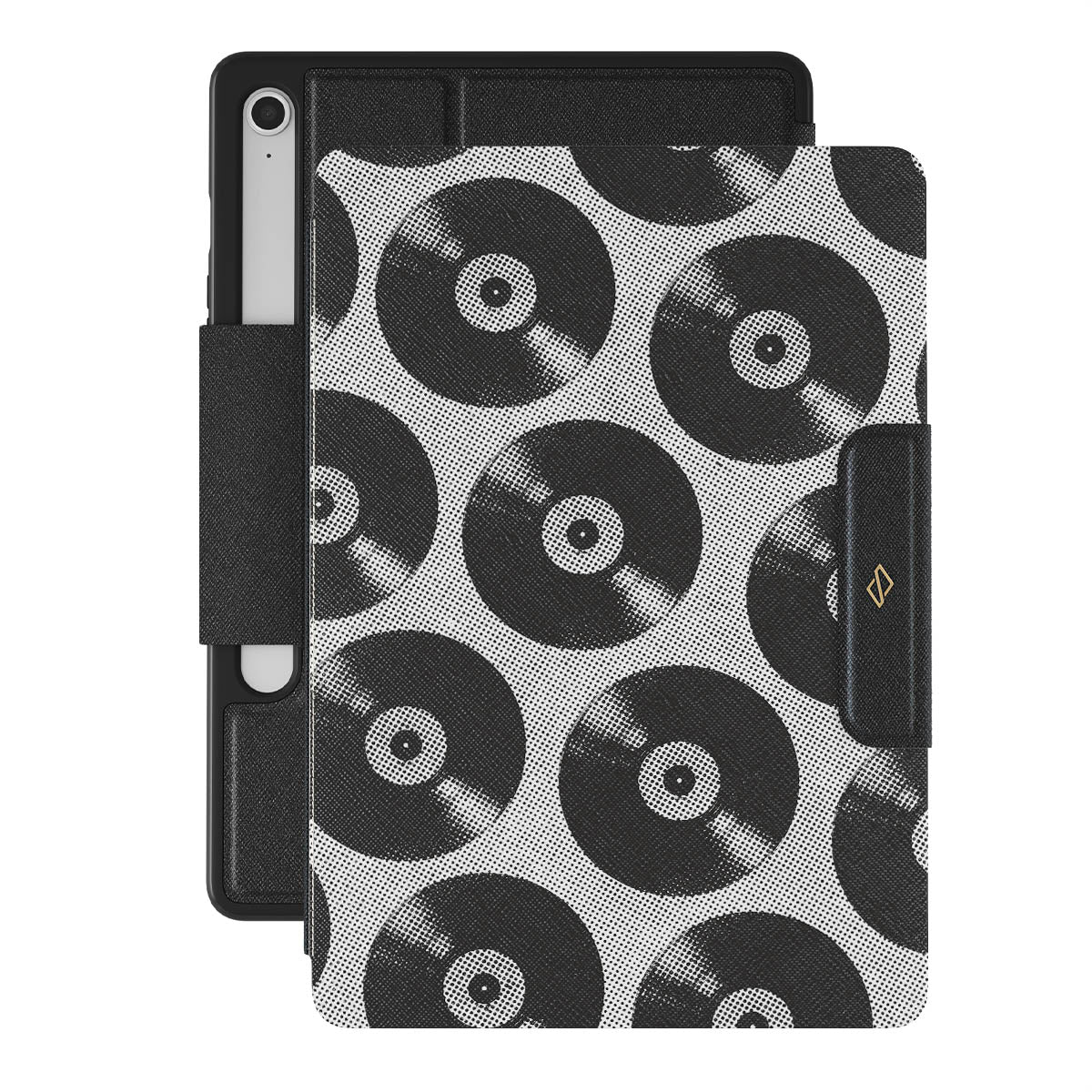 Características de este diseño: discos de vinilo, blanco y negro, música