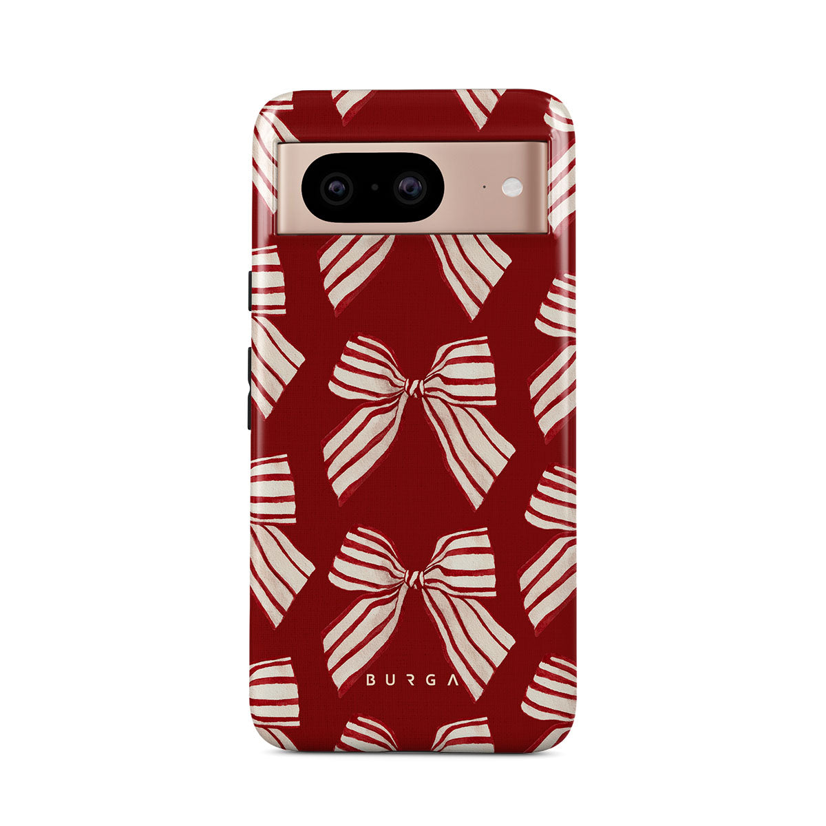 El diseño presenta: moños, rayas, rojo, blanco, motivos navideños.