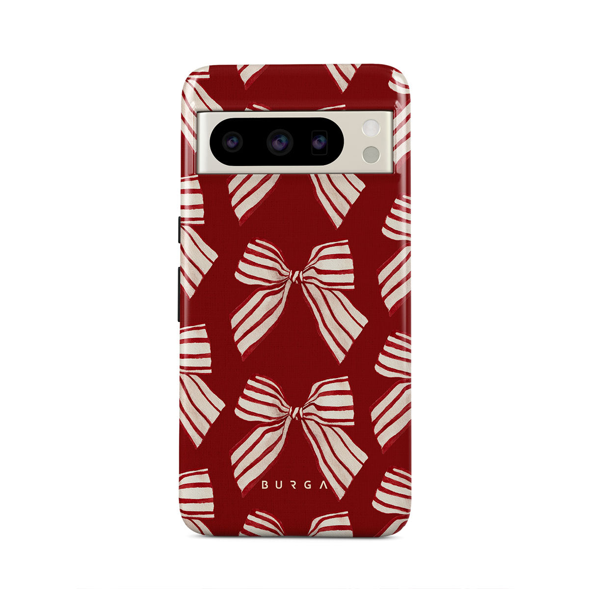 El diseño presenta: moños, rayas, rojo, blanco, motivos navideños.