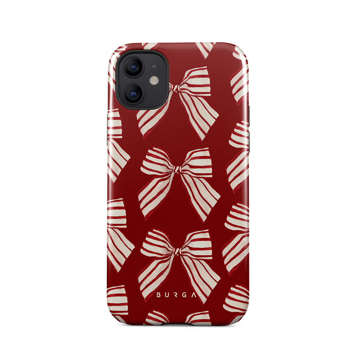 El diseño presenta: moños, rayas, rojo, blanco, motivos navideños.
