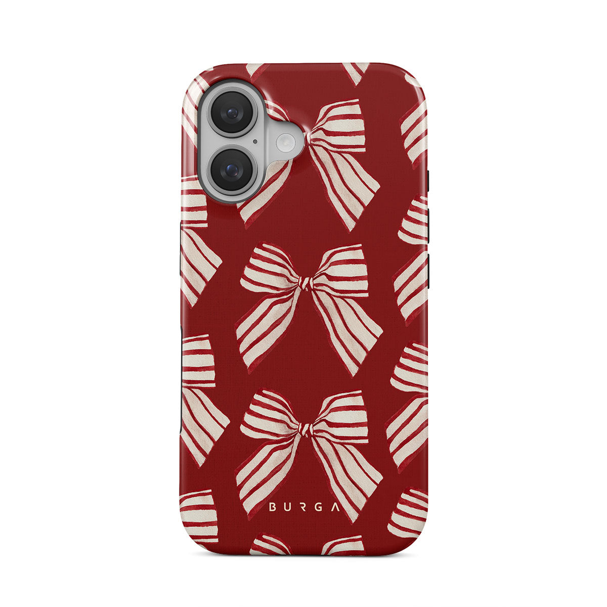 El diseño presenta: moños, rayas, rojo, blanco, motivos navideños.