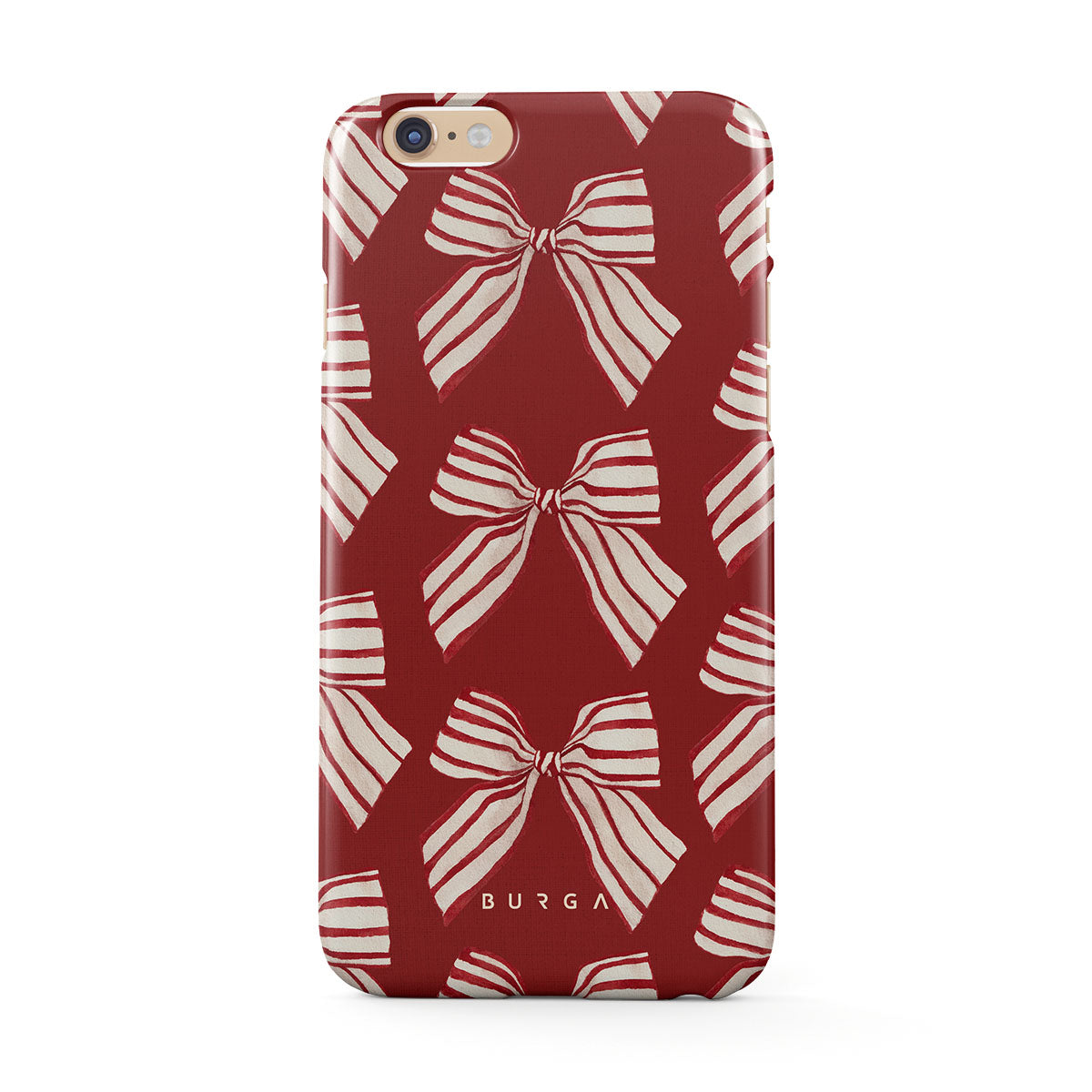 El diseño presenta: moños, rayas, rojo, blanco, motivos navideños.
