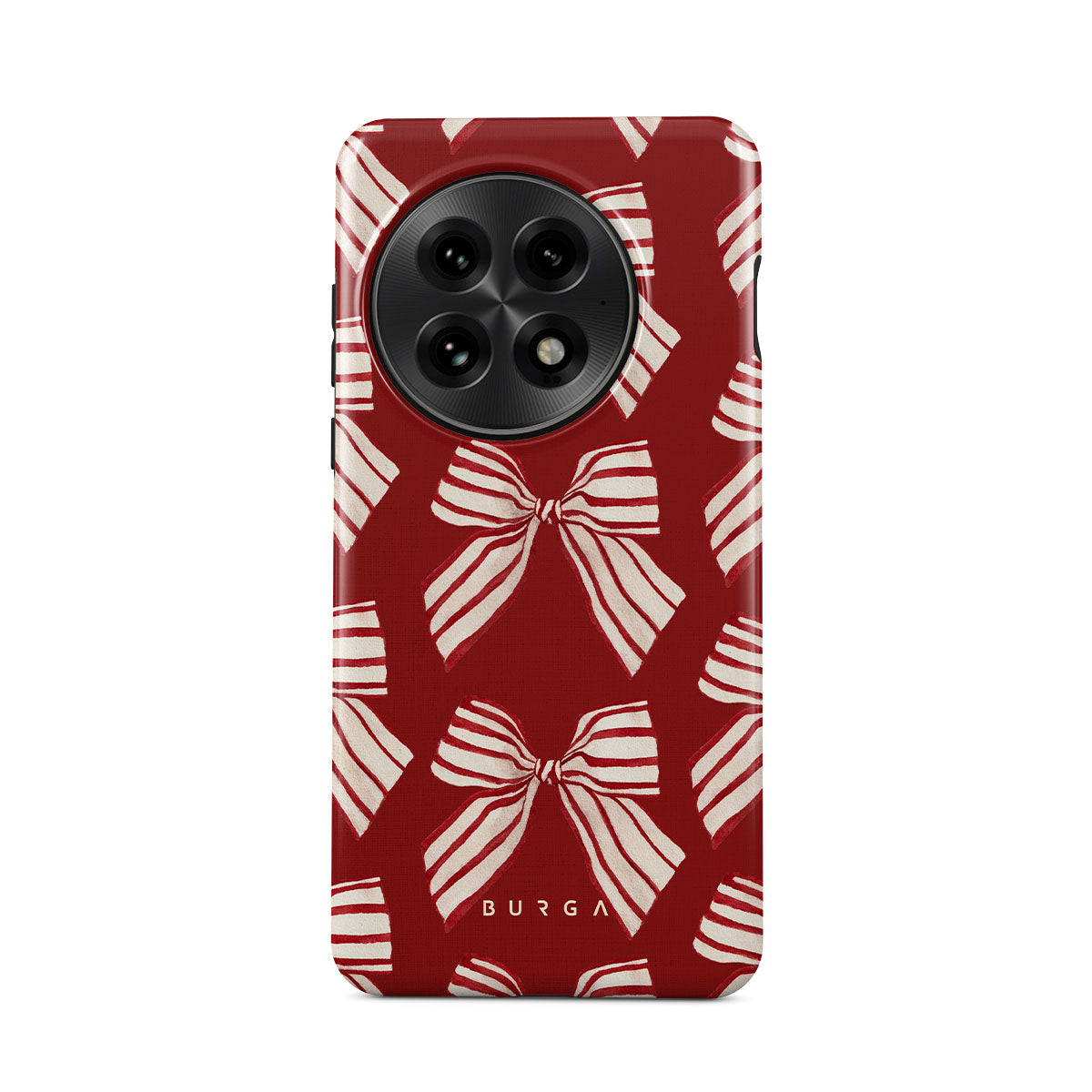El diseño presenta: moños, rayas, rojo, blanco, motivos navideños.