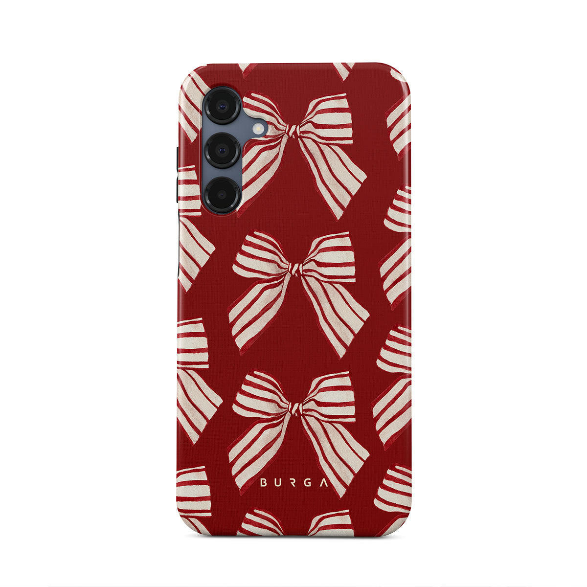 El diseño presenta: moños, rayas, rojo, blanco, motivos navideños.