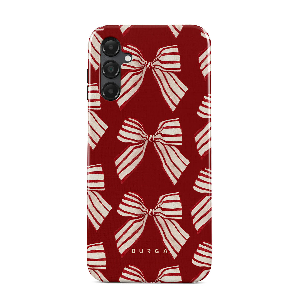 El diseño presenta: moños, rayas, rojo, blanco, motivos navideños.