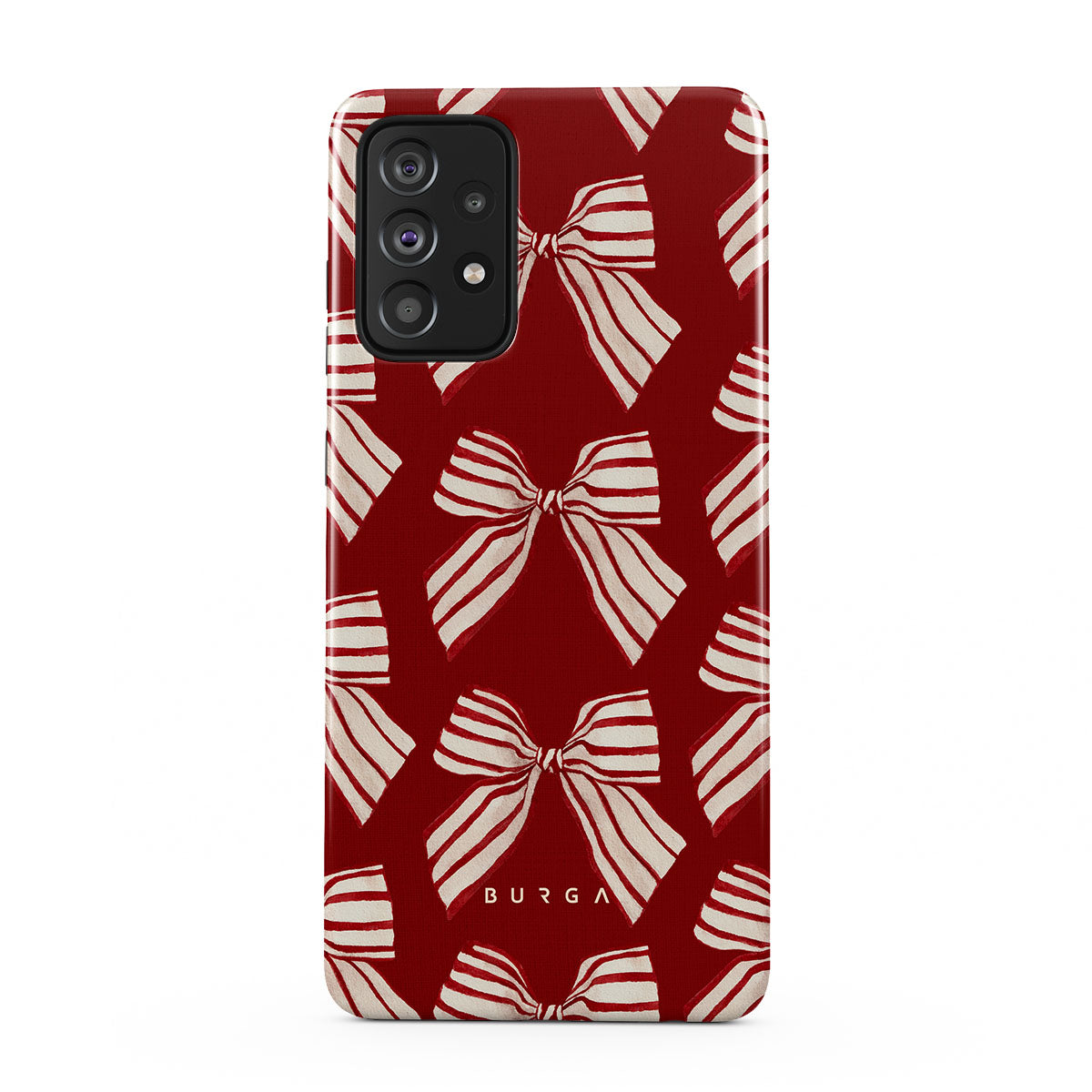 El diseño presenta: moños, rayas, rojo, blanco, motivos navideños.