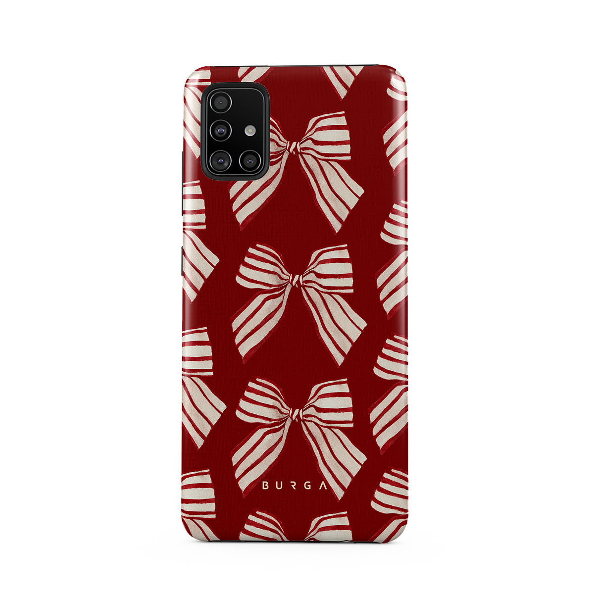 El diseño presenta: moños, rayas, rojo, blanco, motivos navideños.