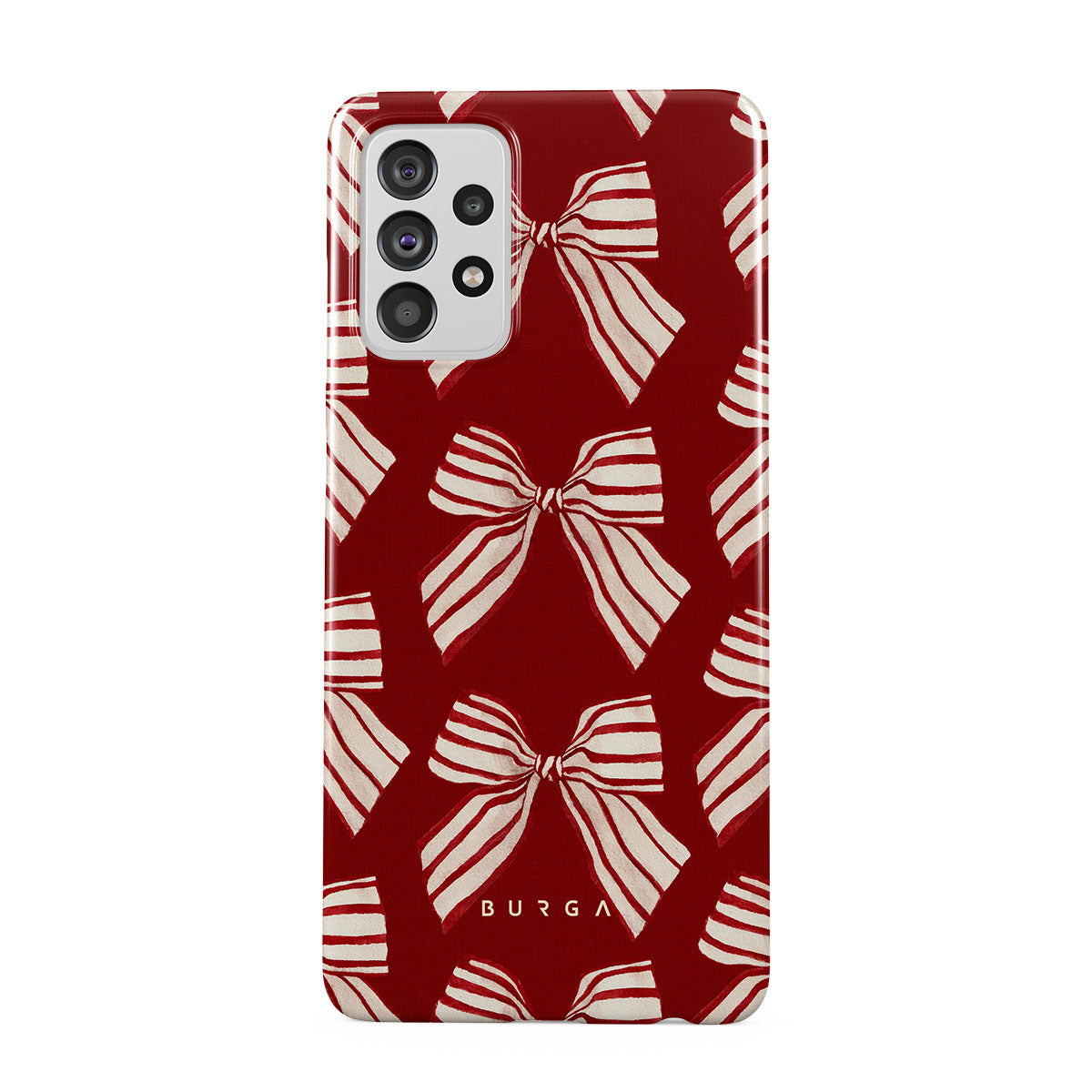 El diseño presenta: moños, rayas, rojo, blanco, motivos navideños.