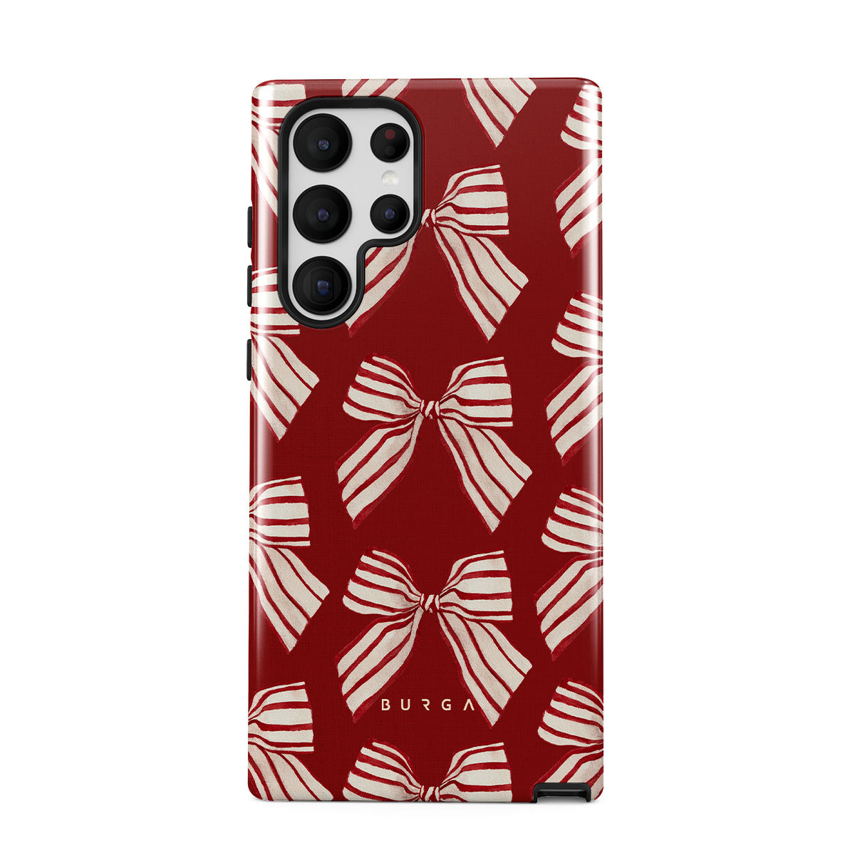 El diseño presenta: moños, rayas, rojo, blanco, motivos navideños.
