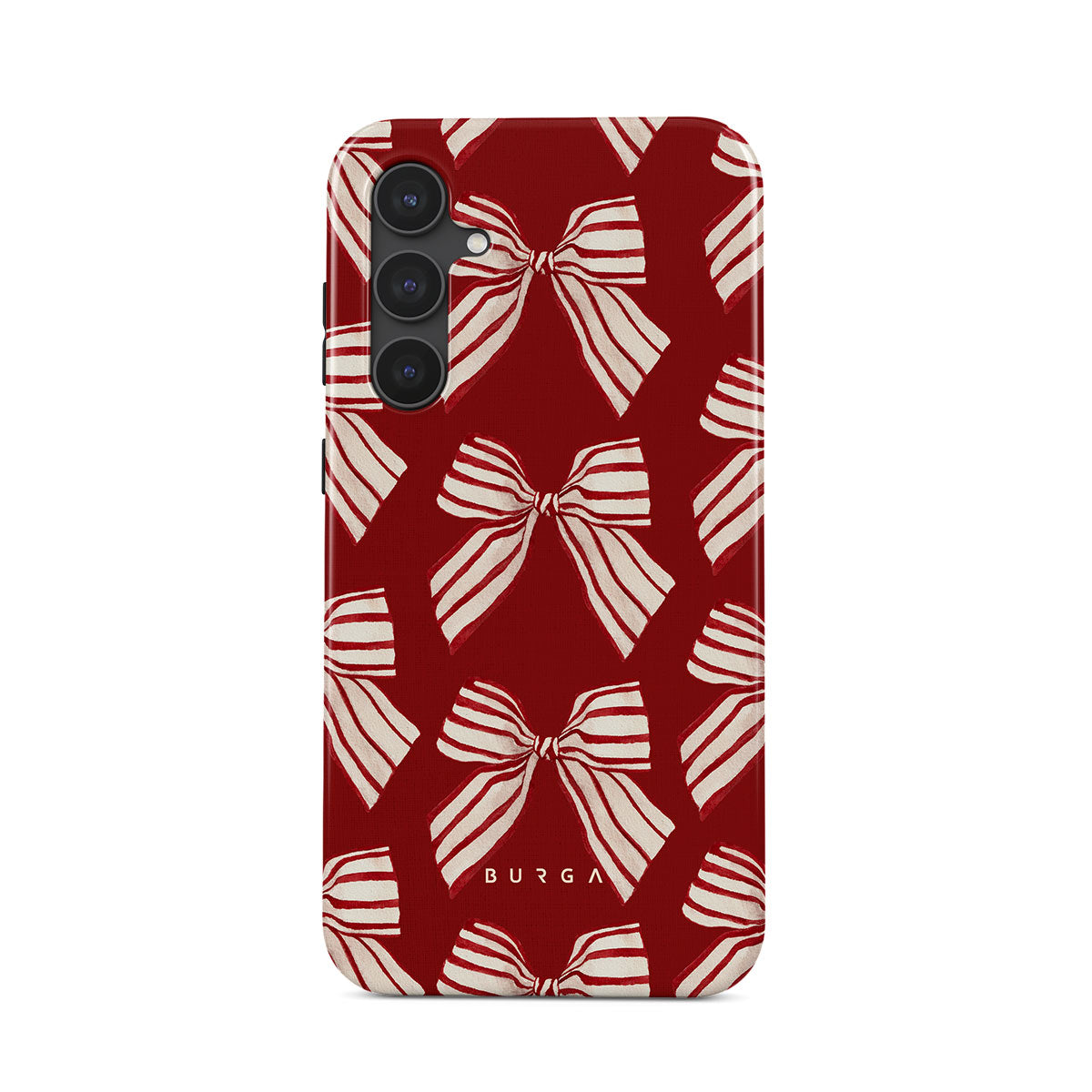 El diseño presenta: moños, rayas, rojo, blanco, motivos navideños.